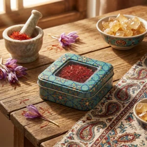 ظرف فلزی زعفران مدل مربعی طرح دار- فیروزه دو مثقال