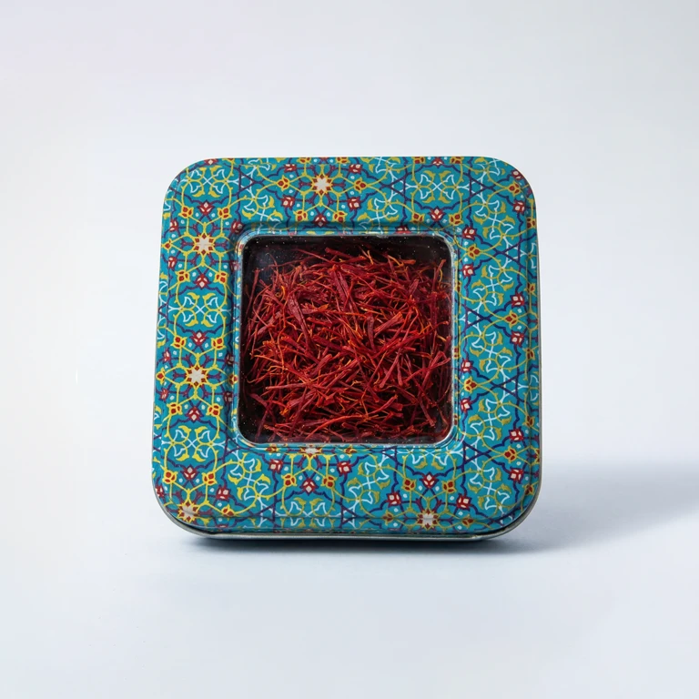 ظرف فلزی زعفران مدل مربعی طرح دار- فیروزه دو مثقال